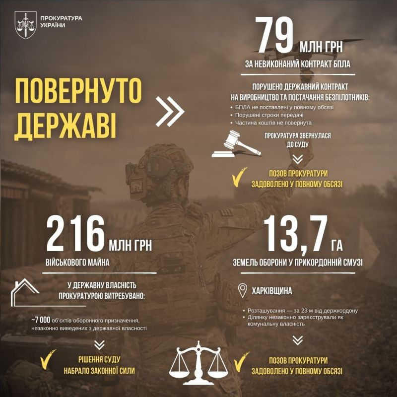 Спеціалізовані прокуратури у сфері оборони продовжують системно повертати державі ресурси, що мають працювати на безпеку та обороноздатність. Йдеться про кошти за невиконані оборонні контракти, об’єкти військової інфраструктури, незаконно виведені з державної власності, а також стратегічні землі прикордонної смуги.