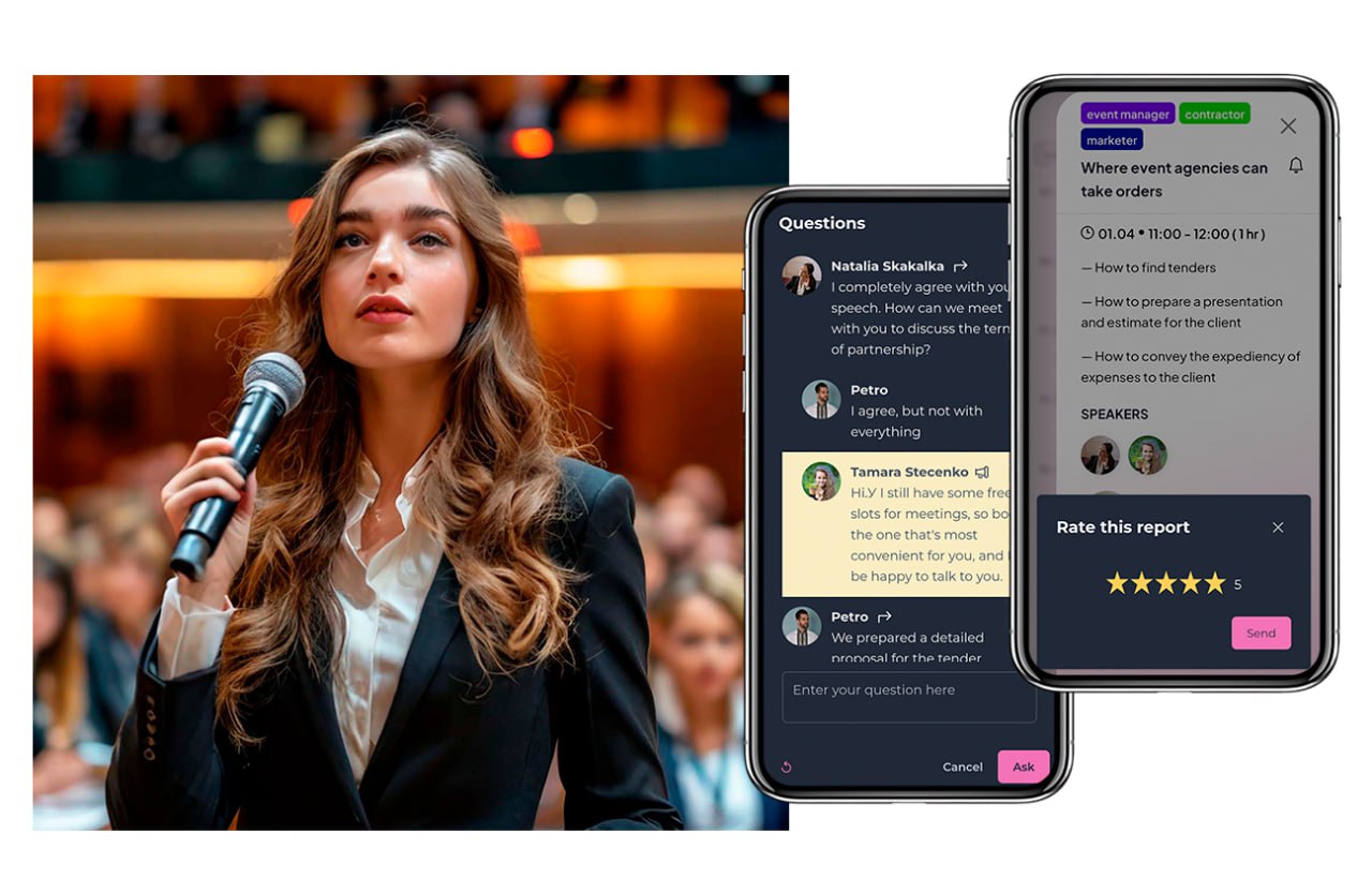 - Live-взаємодія зі спікерами: запитання, голосування та активності в реальному часі навіть на масштабних заходах.
