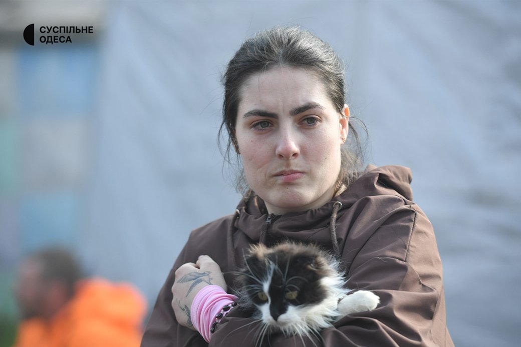 Мешканка Валентина разом зі своєї кицькою на місці атаки в Одесі 16 квітня 2026 року. Суспільне Одеса/Борис Бухман