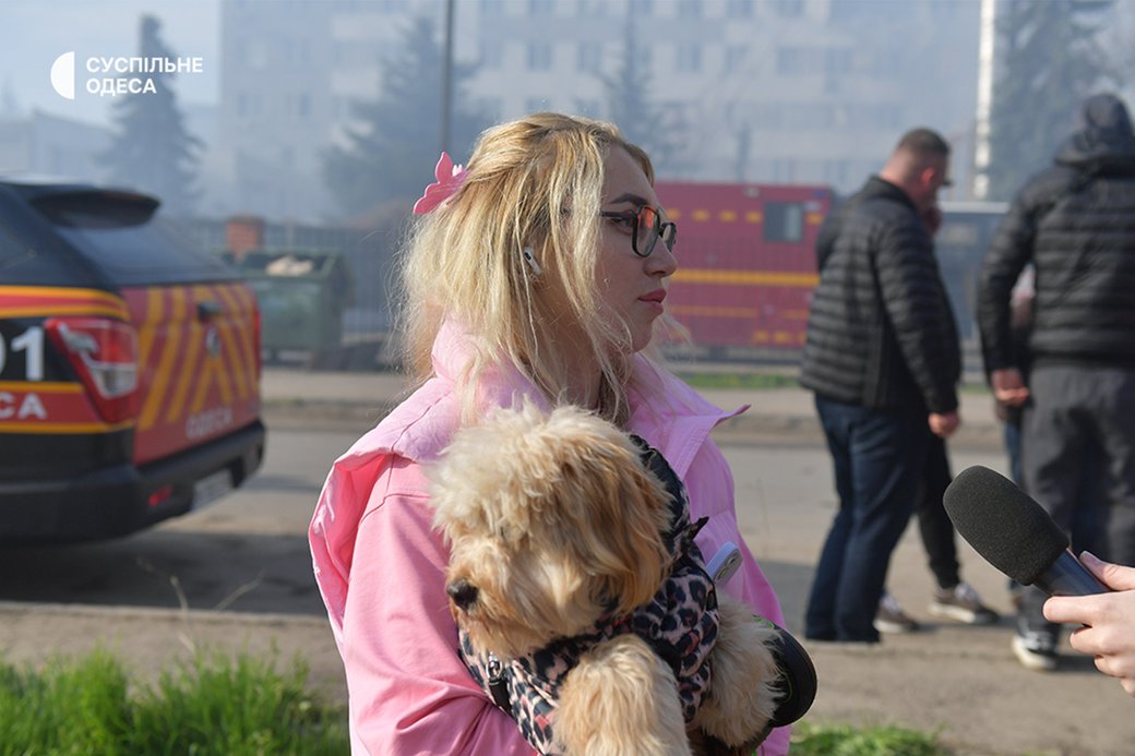 Мешканка Тетяна зі своїм собакою на місці атаки в Одесі, 16 квітня 2026 року. Суспільне Одеса/Борис Бухман