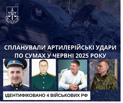 За процесуального керівництва Сумської обласної прокуратури заочно оголошено підозру чотирьом військовослужбовцям командного складу 30 мотострілецького полку (в/ч 72162) 72 мотострілецької дивізії 44-го армійського корпусу Ленінградського військового округу збройних сил рф, які спланували артилерійські удари по м. Суми.