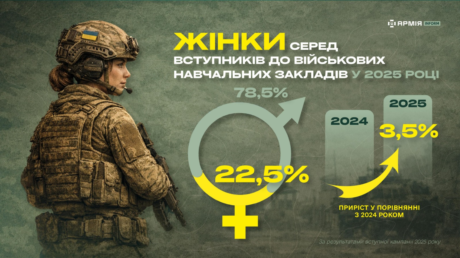 За результатами вступної кампанії 2025 року співвідношення здобувачів освіти жіночої статі, яких зараховано до військових навчальних закладів, становить — 22,5% від загальної кількості вступників.