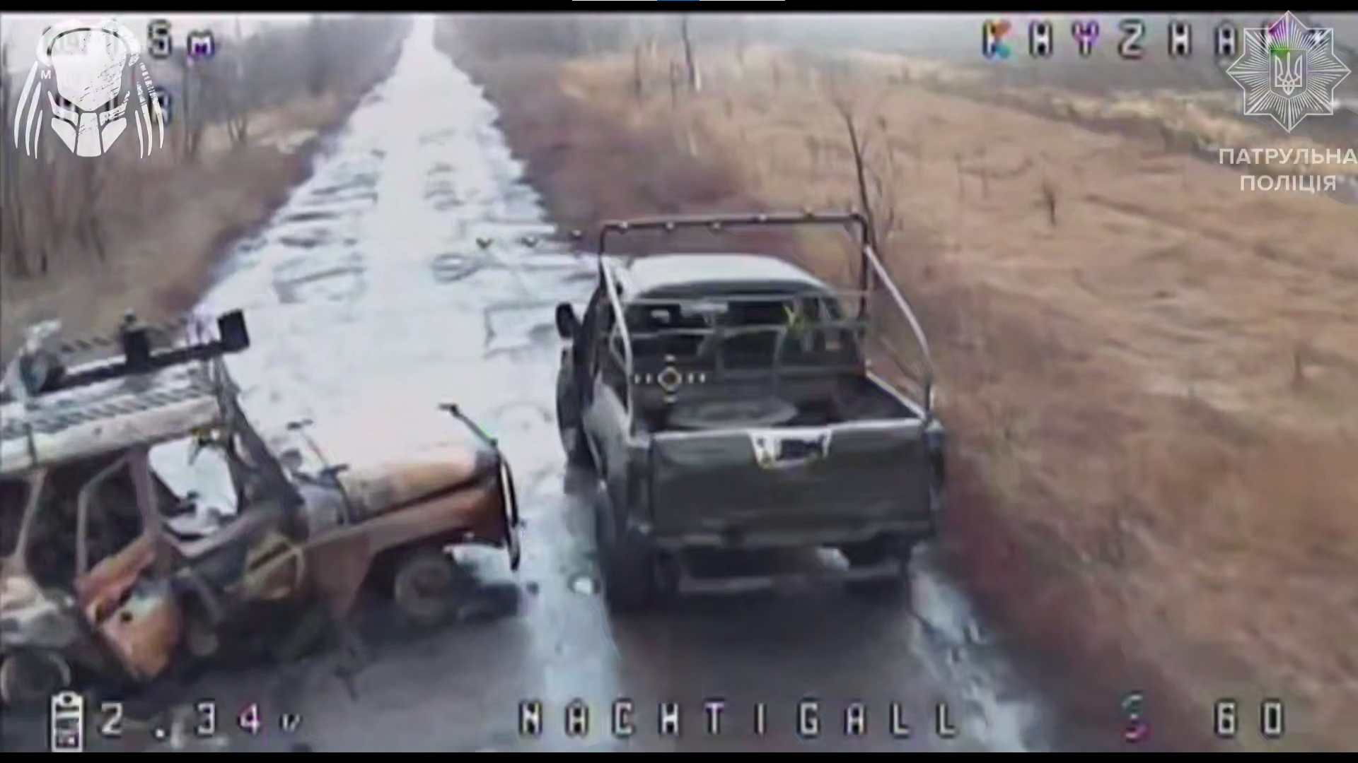 Пілоти FPV-дронів бригади «Хижак» при Департаменті патрульної поліції уразили російське авто, яке загальмувало біля спаленої раніше машини.