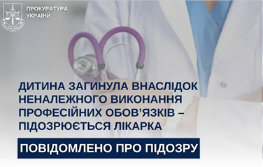 За процесуального керівництва ювенальних прокурорів Чернігівської окружної прокуратури повідомлено про підозру лікарці, яка неналежно виконала свої професійні обов’язки внаслідок недбалого до них ставлення, що спричинило тяжкі наслідки для неповнолітньої хворої у вигляді смерті (ч. 2 ст. 140 КК України).