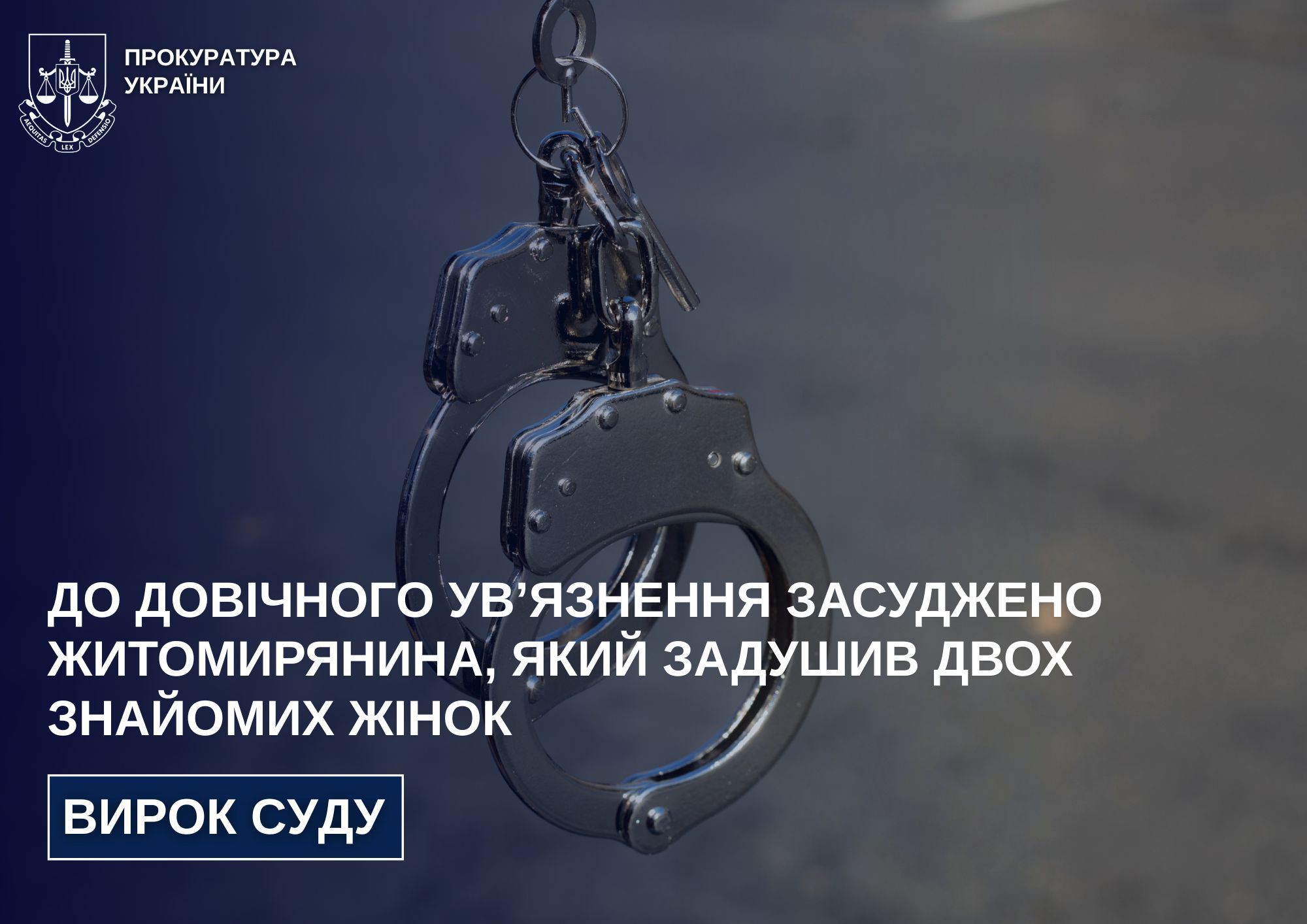 За підтримання публічного обвинувачення прокурорами Житомирської обласної прокуратури визнано винним чоловіка, який вбив двох знайомих жінок, задушивши їх.