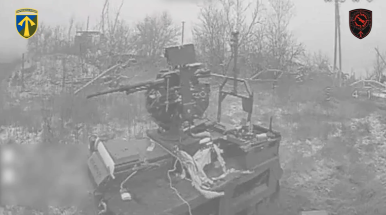 Ворог намагається використовувати наземні роботизовані комплекси в першу чергу для логістики та забезпечення. Проте, можна помітити й бойових роботів, один з яких також був уражений.