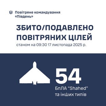За даними Повітряного командування «Південь», станом на 9:30 17 листопада сили протиповітряної оборони збили або подавили 54 ворожі безпілотники типів Shahed, «Гербера» та інших моделей. Із них 52 були ліквідовані над територією Одеської області.