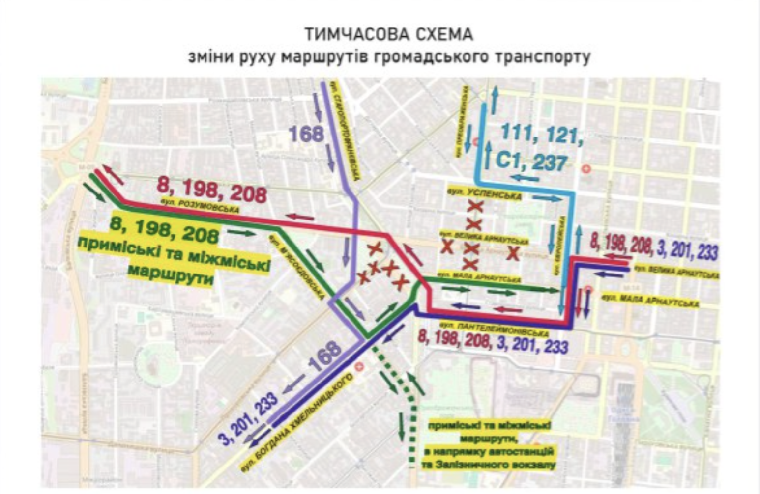 Автобусні маршрути №№ 3, 201, 233, а також приміські та міжміські маршрути під час руху у напрямку вулиці Богдана Хмельницького (з вулиці Великої Арнаутської) курсують так: