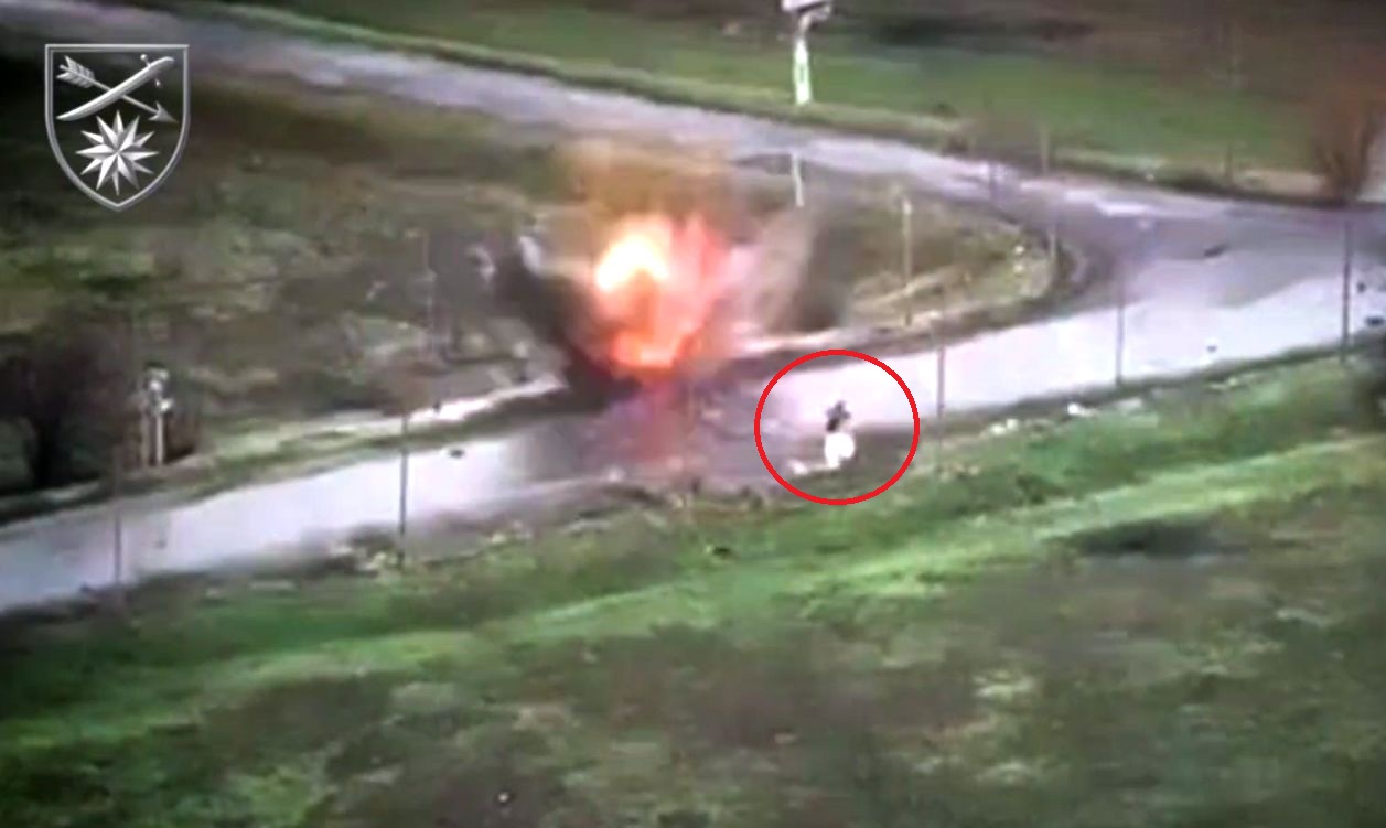 При цьому зазначається, що окупанту не тільки вдалося вціліти після прильоту буквально в п’яти метрах від нього, а й продовжити біг, поки його не зупинив вже назавжди FPV-дрон 112-ї окремої бригади ТрО.