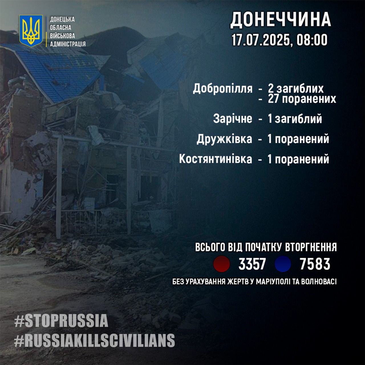 Всього за добу росіяни 30 разів обстріляли населені пункти Донеччини. З лінії фронту евакуйовано 264 людини, у тому числі 17 дітей.