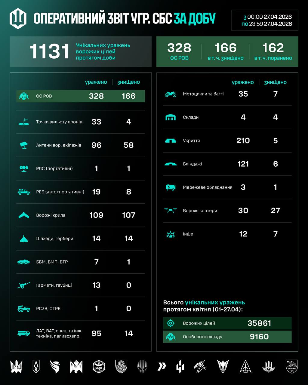 З початку квітня (01–27.04) підрозділами СБС уражено 35861 ціль противника, з них 9160 — особовий склад.