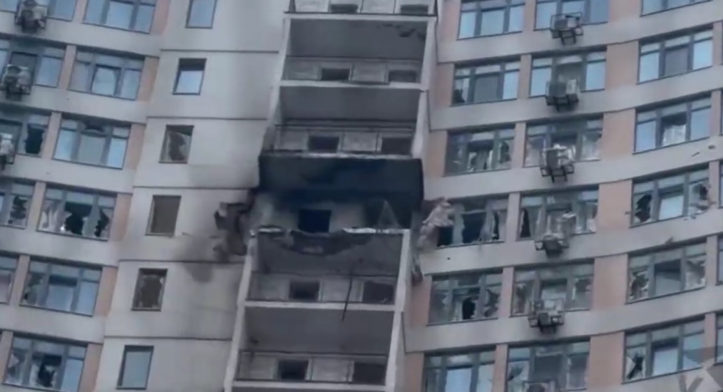 Один із дронів влучив у 25-поверховий житловий будинок. Ще один безпілотник упав поблизу приватного домоволодіння, пошкодивши фасад і скління будівлі.