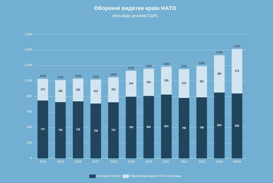 В абсолютних цифрах найбільші витрати на оборону і надалі здійснюють США — $838 мільярдів торік (на $12 млрд менше, ніж у 2024-му). На частку Сполучених Штатів припадало 60% сукупних витрат країн НАТО на оборону.