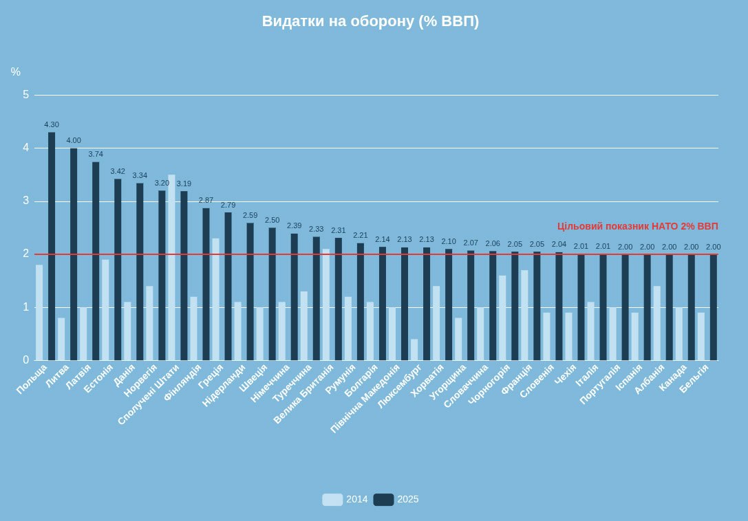 Найбільше серед членів НАТО у відсотковому співвідношенні на оборону у 2025 році витратила Польща — 4,3% ВВП. Далі йдуть країни Балтії — Литва, Латвія та Естонія. Всі ці країни посилюють свій захист на тлі тривалої російської агресії в Україні.
