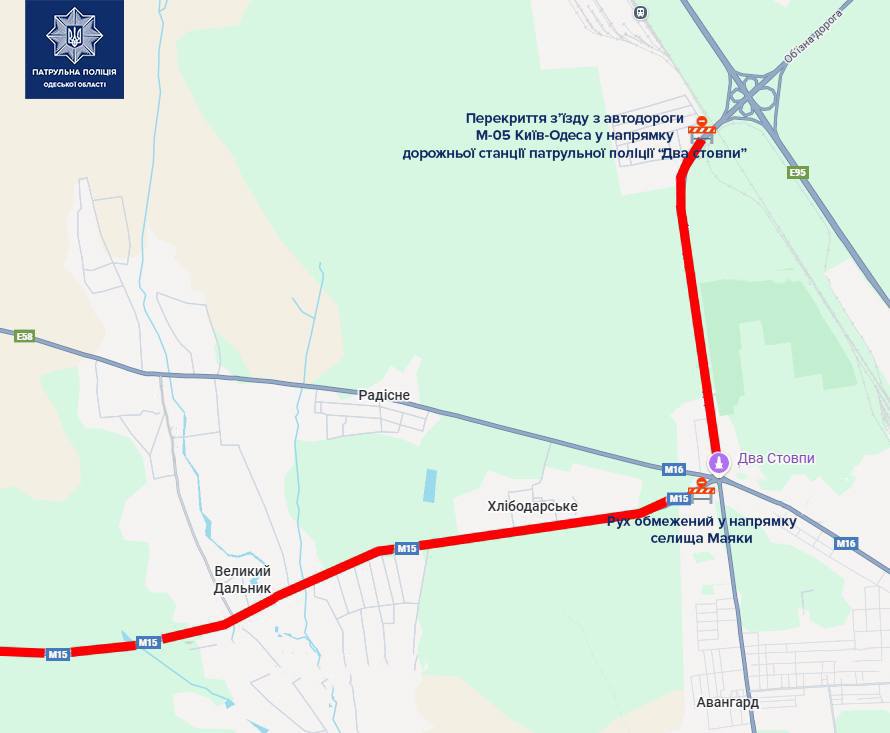 Як повідомили у Службі відновлення та розвитку інфраструктури в Одеській області, на автодорозі М-15 обмежено рух від дорожньої станції патрульної поліції «Два Стовпи» у напрямку села Маяки. Об’їзд організовано автодорогою М-16 — у напрямку населеного пункту Кучургани.