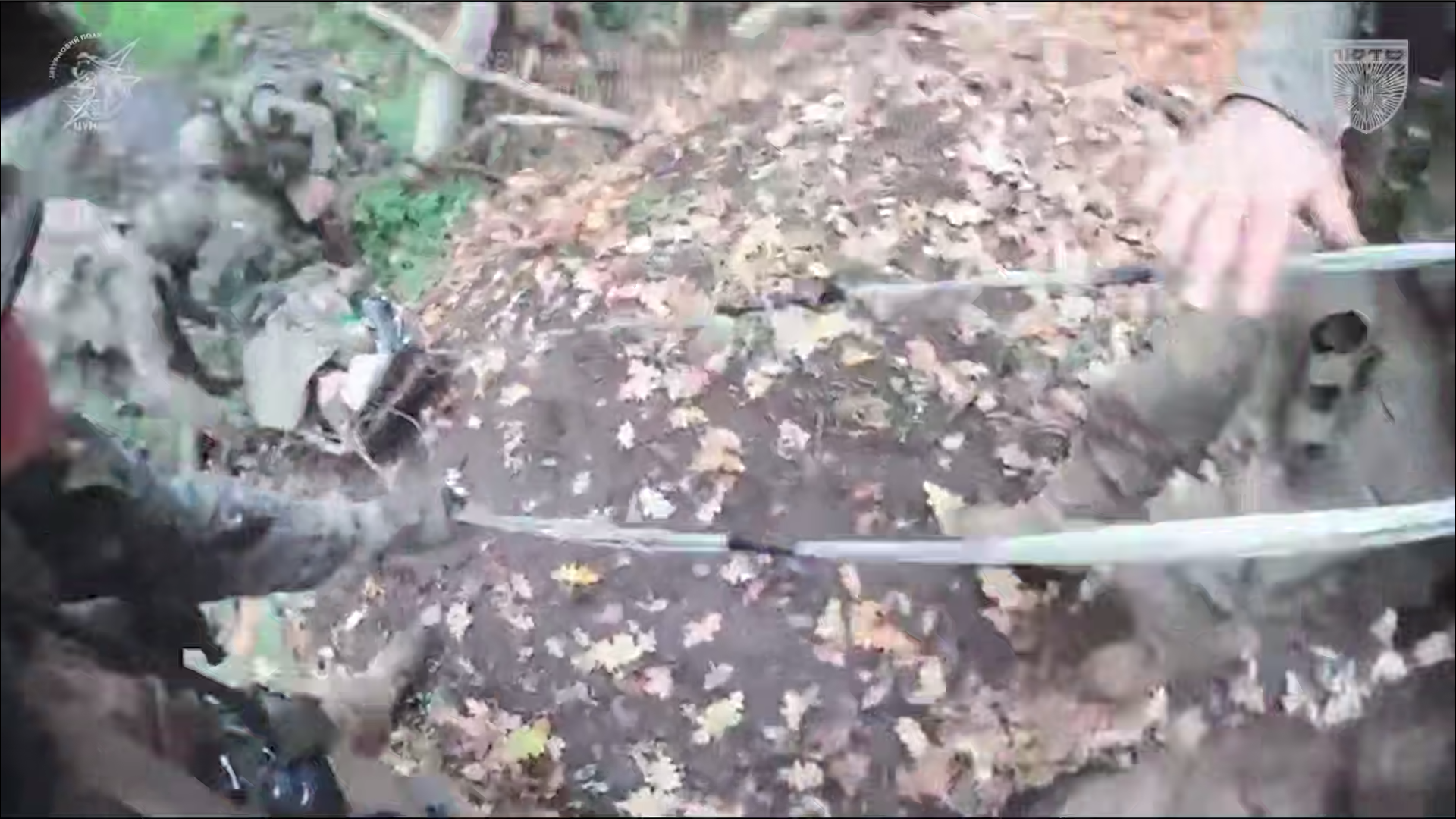 Ноші з пораненим перетягують через яр. Скрін з відео Нацполіції