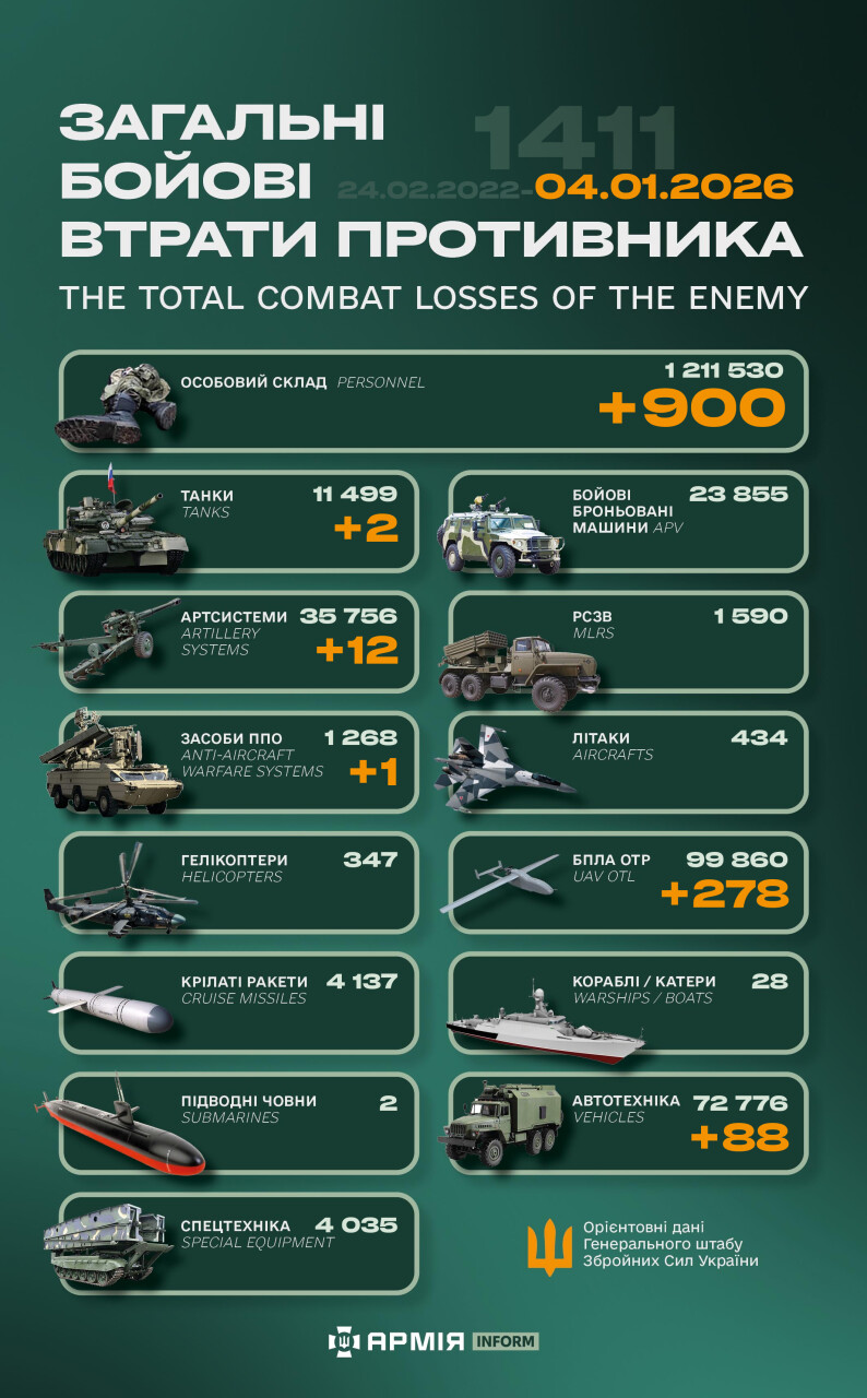 Загальні бойові втрати противника з 24.02.22 по 04.01.26 орієнтовно склали: