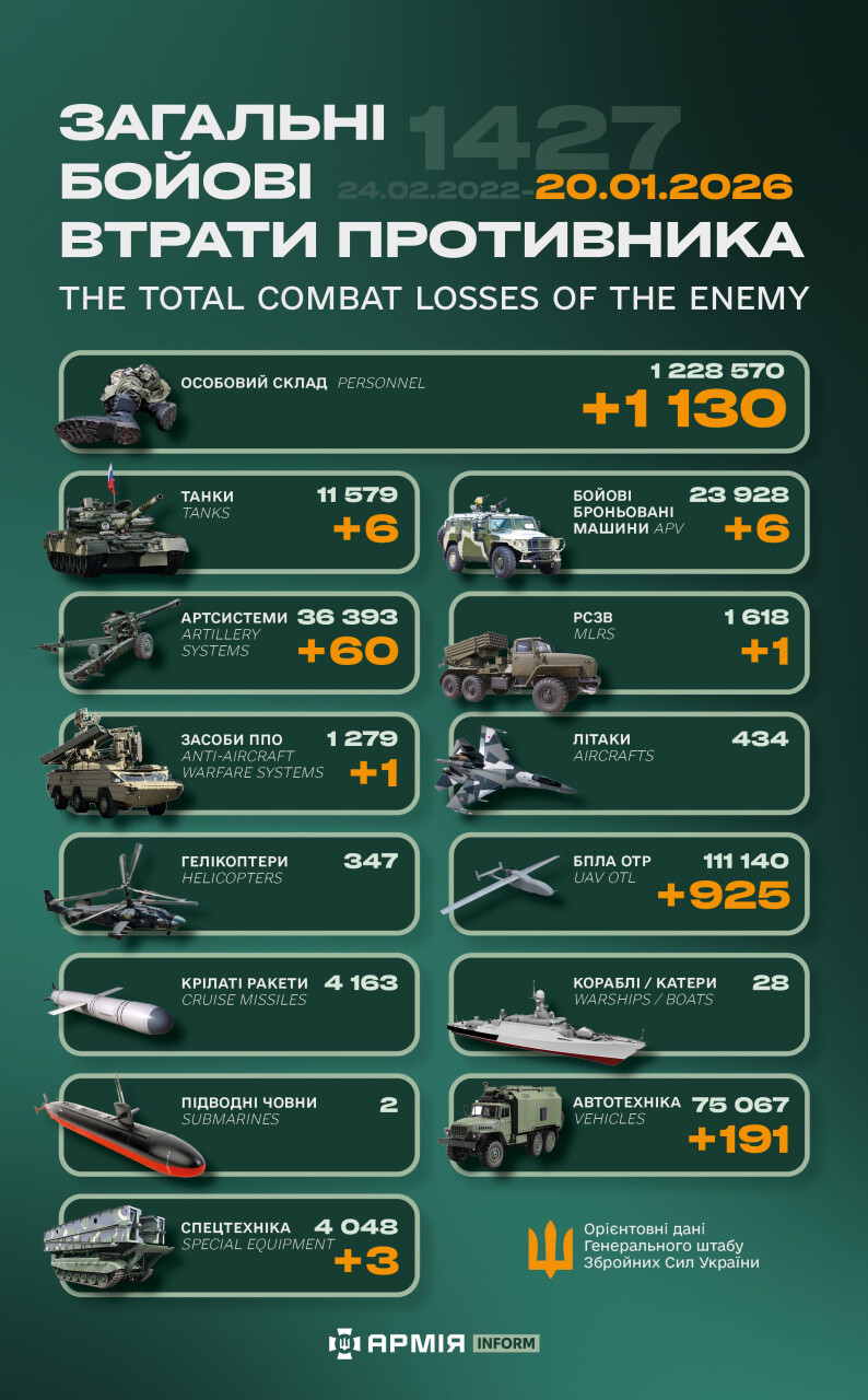 Загальні бойові втрати противника з 24.02.22 по 20.01.26 орієнтовно становлять: