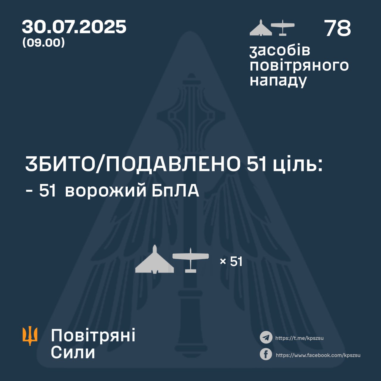 У ніч на 30 липня (із 22.30 29 липня) противник атакував 78-ма ударними БпЛА типу Shahed і безпілотниками-імітаторами різних типів із напрямків: Орел, Курськ, Гвардійське — ТОТ Криму.