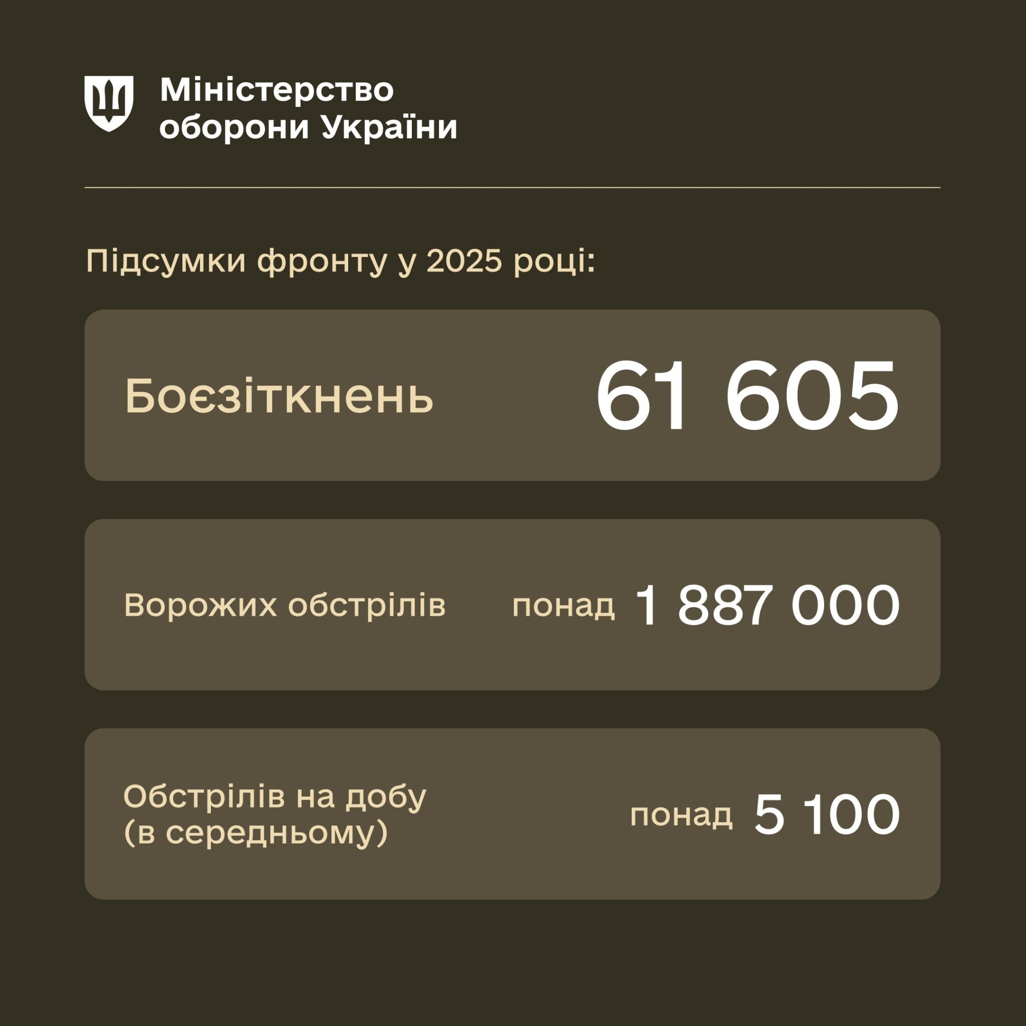 Упродовж 2025 року інтенсивність бойових дій на фронті залишалась високою. За повідомленнями Генерального штабу ЗСУ, загальна кількість боєзіткнень за рік склала 61 605.