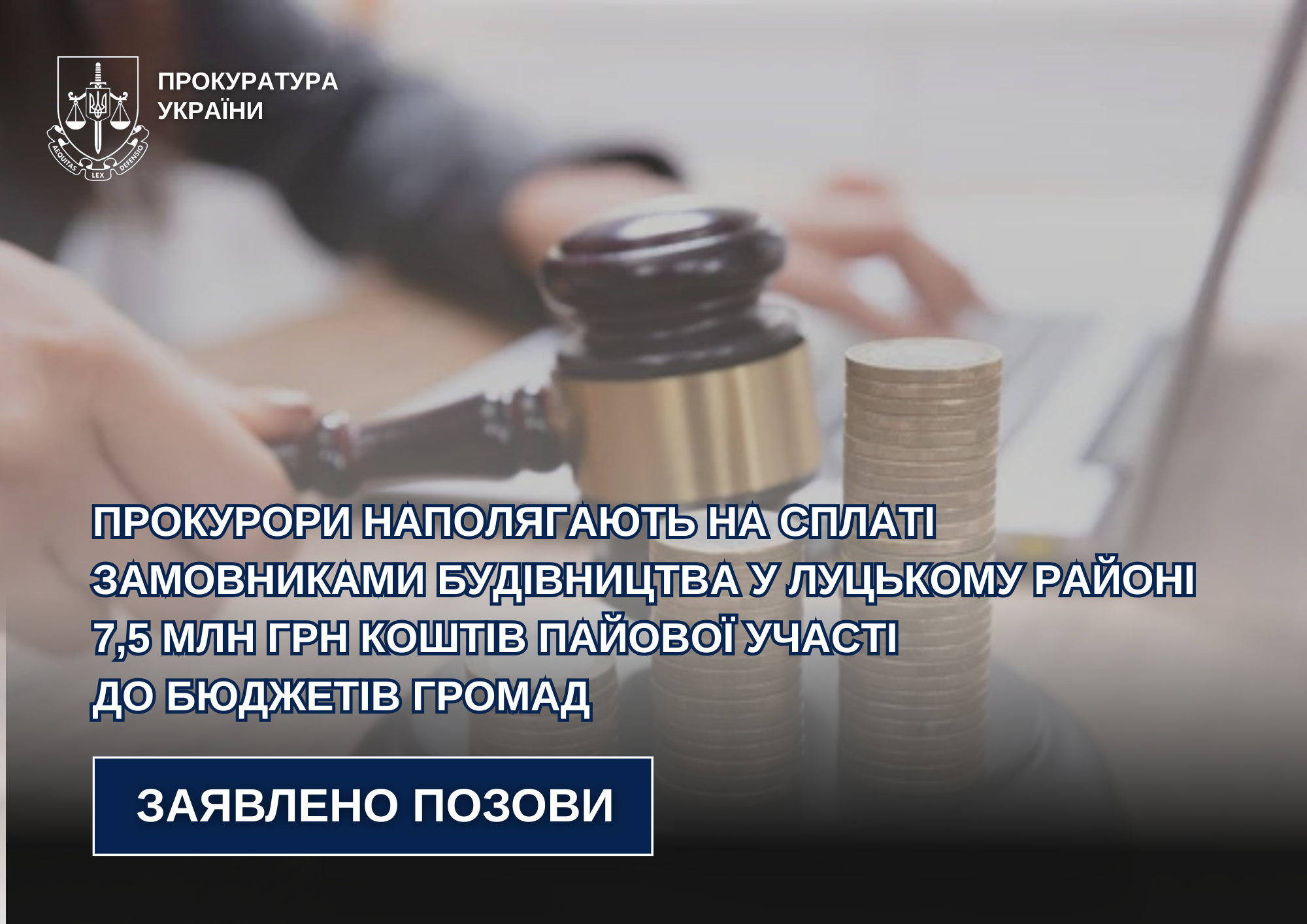 Зауважимо, що з початку 2026 року окружною прокуратурою заявлено до судів 12 позовів в інтересах Підгайцівської сільської та Луцької міської рад про стягнення із замовників будівництва до місцевих бюджетів коштів пайової участі на загальну суму понад 7,5 мільйона гривень.
